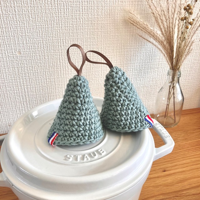 三角のカタチがかわいい三角ミトンの2個セット△ ストウブやル・クルーゼなど両手鍋の取手や、ふたの取手(ノブ)を掴む際に♪ ●素材…コットン100% ナチュラルで素朴な風合いのコットンで編みました。 コットンは熱に強い素材で、熱いお鍋を持っても溶けたり切れる心配もないのでコットン素材にこだわりました。 フタの取手や持ち手を掴んだり、オーブン皿にお使いください。 ●サイズ 2つとも同じサイズです。 ・高さ…9cm ・直径…7cm ストウブ ラウンド22cmも両手の取手を掴めることを確認しております。 小さなサイズのお鍋に使用する際は、裾をクルッと折り返すことでちょうど良いサイズとしてお使い頂けます。 ●色…ターコイズグリーン 他にも違う色やサイズで出品しております ※色味は、写真と実物では若干異なる場合がございます。また商品の特性上、伸びや歪みが生じることがありますので、ご注意ください。 ●その他 ※写真に写っている鍋、その他小物は撮影用の備品です。お送りするのは鍋つかみ2個セットのみとなります。 #ストウブ #STAUB #なべつかみ #鍋つかみ #鍋掴み #三角鍋つかみ #三角ミトン #キッチンミトン #ノブミトン #ハンドメイド