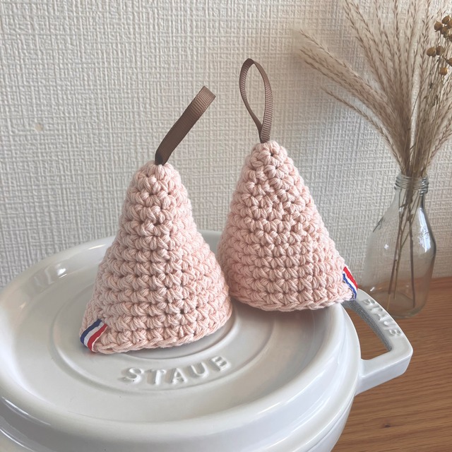 三角のカタチがかわいい三角ミトンの2個セット△ ストウブやル・クルーゼなど両手鍋の取手や、ふたの取手(ノブ)を掴む際に♪ ●素材…コットン100% ナチュラルで素朴な風合いのコットンで編みました。 コットンは熱に強い素材で、熱いお鍋を持っても溶けたり切れる心配もないのでコットン素材にこだわりました。 フタの取手や持ち手を掴んだり、オーブン皿にお使いください。 ●サイズ 2つとも同じサイズです。 ・高さ…9cm ・直径…7cm ストウブ ラウンド22cmも両手の取手を掴めることを確認しております。 小さなサイズのお鍋に使用する際は、裾をクルッと折り返すことでちょうど良いサイズとしてお使い頂けます。 ●色…シェルピンク 他にも違う色やサイズで出品しておりますのでぜひご覧ください。 ※色味は、写真と実物では若干異なる場合がございます。また商品の特性上、伸びや歪みが生じることがありますので、ご注意ください。 ●その他 ※写真に写っている鍋、その他小物は撮影用の備品です。お送りするのは鍋つかみ2個セットのみとなります。 #ストウブ #STAUB #なべつかみ #鍋つかみ #鍋掴み #三角鍋つかみ #三角ミトン #キッチンミトン #ノブミトン #ハンドメイド