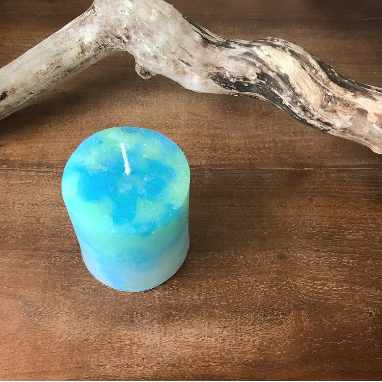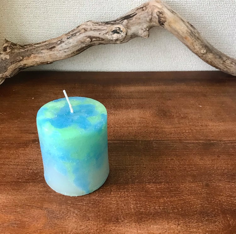 地球みたいな色の円柱キャンドル。