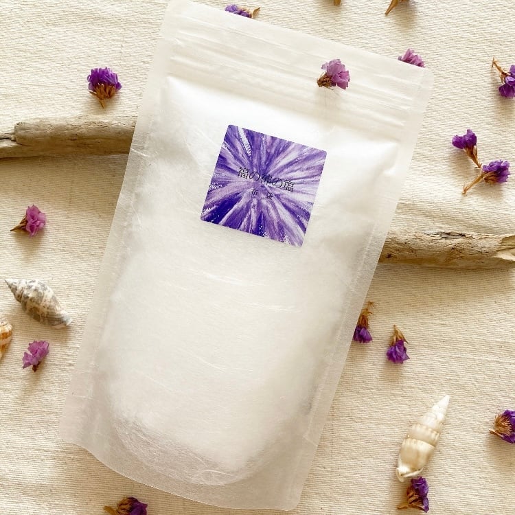 ラベンダーとパチュリのブレンドオイルが香る、非加熱天日塩バスソルトです。